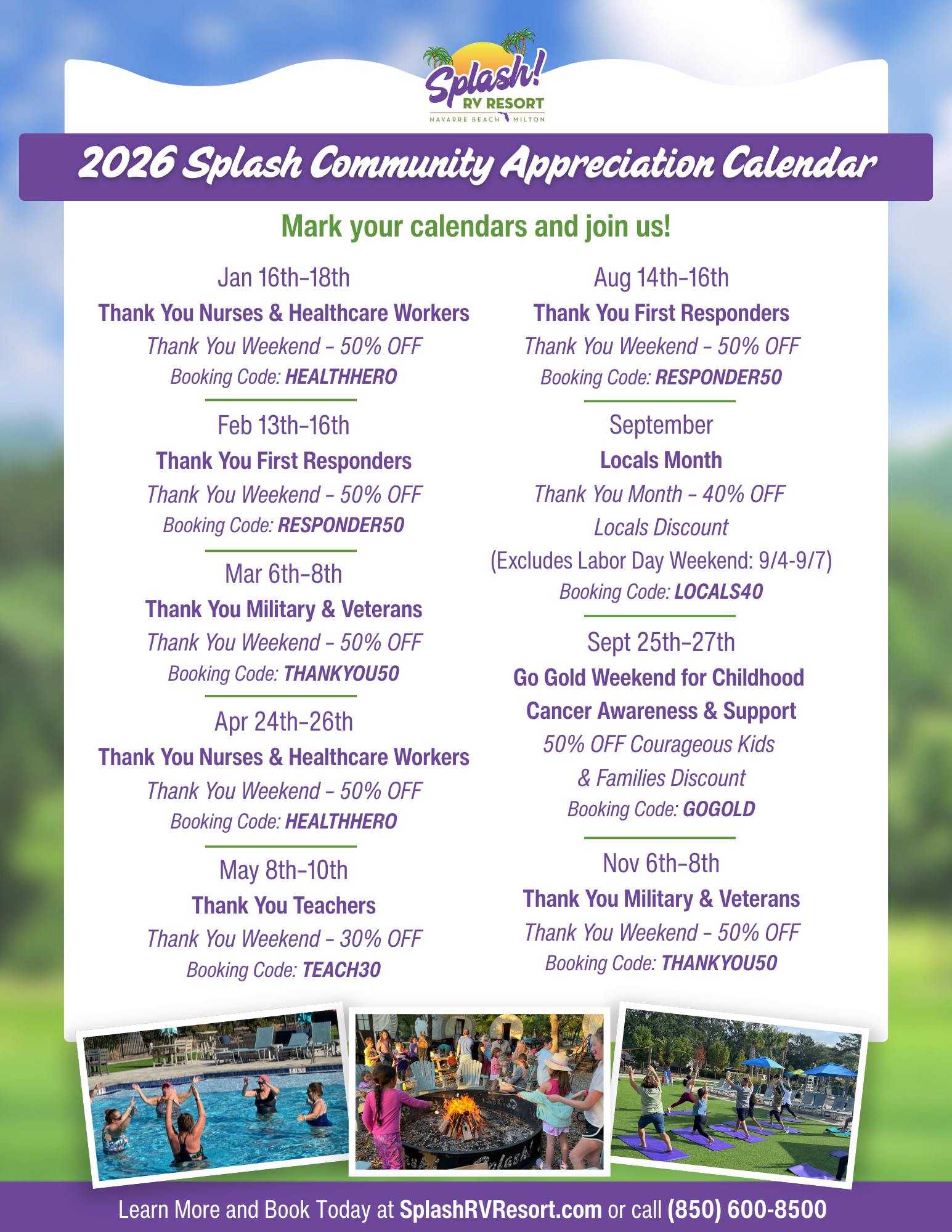 Great deals YEAR-ROUND at Splash RV Resort in Milton, Florida.