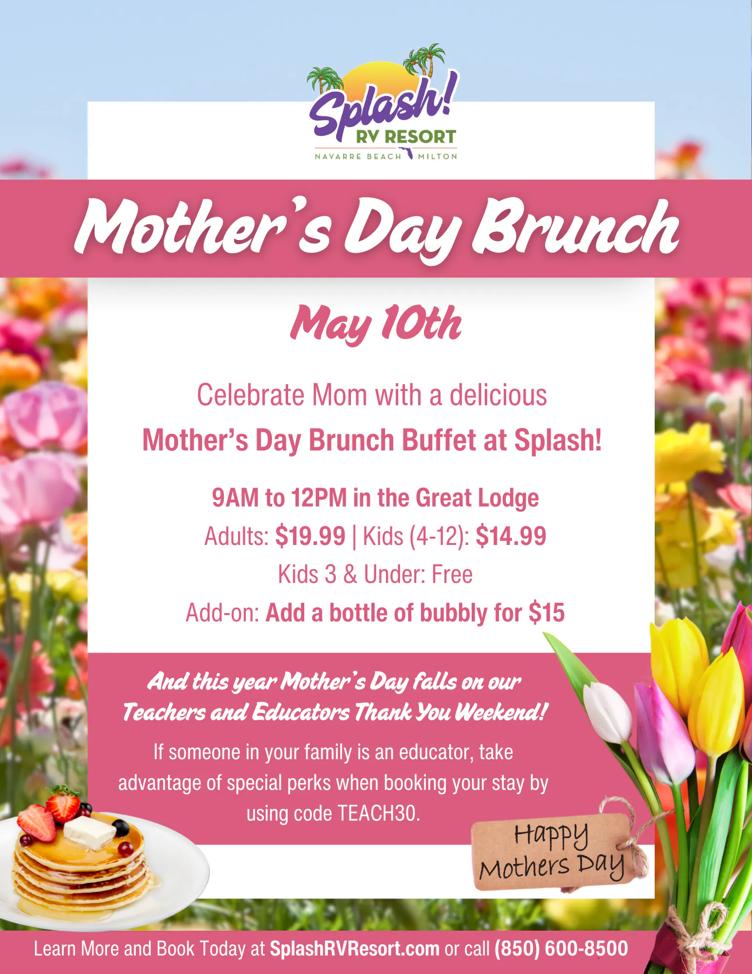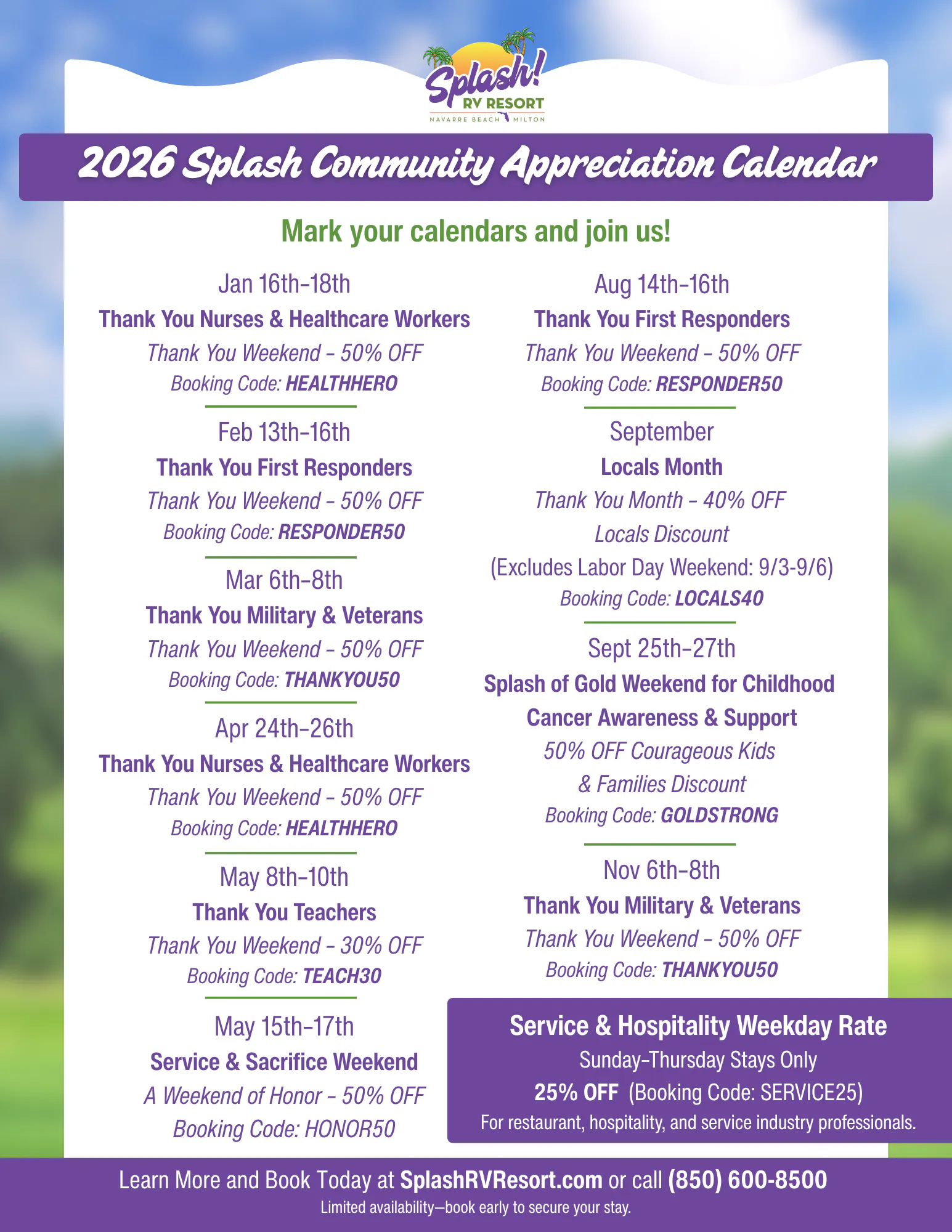 Great deals YEAR-ROUND at Splash RV Resort in Milton, Florida.
